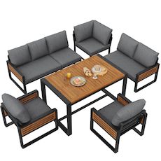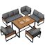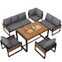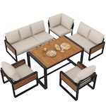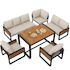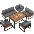 Salon de jardin repas 8 places en métal et bois massif avec canapé, table à manger, coussins