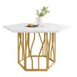 Conception hexagonale moderne, bureau en Panneau composite de fibres de bois à densité avec motif en marbreLe plateau de table présente un design hexagonal unique, rompant avec la convention traditionnelle carrée ou ronde et montrant la personnalité et la mode. La surface est constituée de panneaux Panneau composite de fibres de bois à densité et finie avec un élégant placage de texture de marbre, qui a une texture exquise et est résistant à l'usure et durable. La décoration à motifs géométriques noirs ajoute une touche de style artistique.
