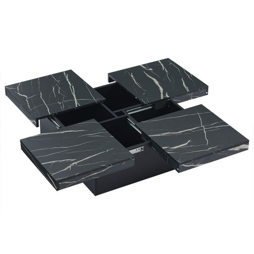 Cette élégante table basse carrée mesure 90 x 90 x 25 cm et allie design moderne et fonctionnalité. Son élégant plateau effet marbre (placage de marbre, pas de vrai marbre) apporte une touche luxueuse à votre salon. Son plateau coulissant permet un accès facile à quatre tiroirs intégrés pour un rangement soigné. Robuste et durable, cette table peut supporter jusqu'à 30 kg, ce qui en fait un choix pratique et élégant pour les intérieurs modernes.