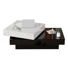 Mesurant 100 x 60 x 35 cm, cette table basse est parfaite pour tous les styles de vie. Il présente un style et une palette de couleurs modernes, un design bicolore, un plateau pivotant unique et des panneaux noirs contrastés et des surfaces blanches qui non seulement offrent de la polyvalence mais c
