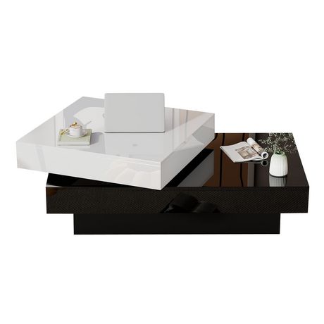 Mesurant 100 x 60 x 35 cm, cette table basse est parfaite pour tous les styles de vie. Il présente un style et une palette de couleurs modernes, un design bicolore, un plateau pivotant unique et des panneaux noirs contrastés et des surfaces blanches qui non seulement offrent de la polyvalence mais créent également un effet visuel saisissant. Le plateau est constitué d'un plateau rotatif dont l'angle peut être modifié selon les besoins. Cela ajoute une certaine touche de design à la table tout en facilitant le placement d'objets sur la table pour afficher des décorations ou obtenir ce dont vous avez besoin. Le plateau de table lisse et brillant, facile à nettoyer, améliore l'apparence et simplifie l'entretien : il suffit de l'essuyer avec un chiffon humide.