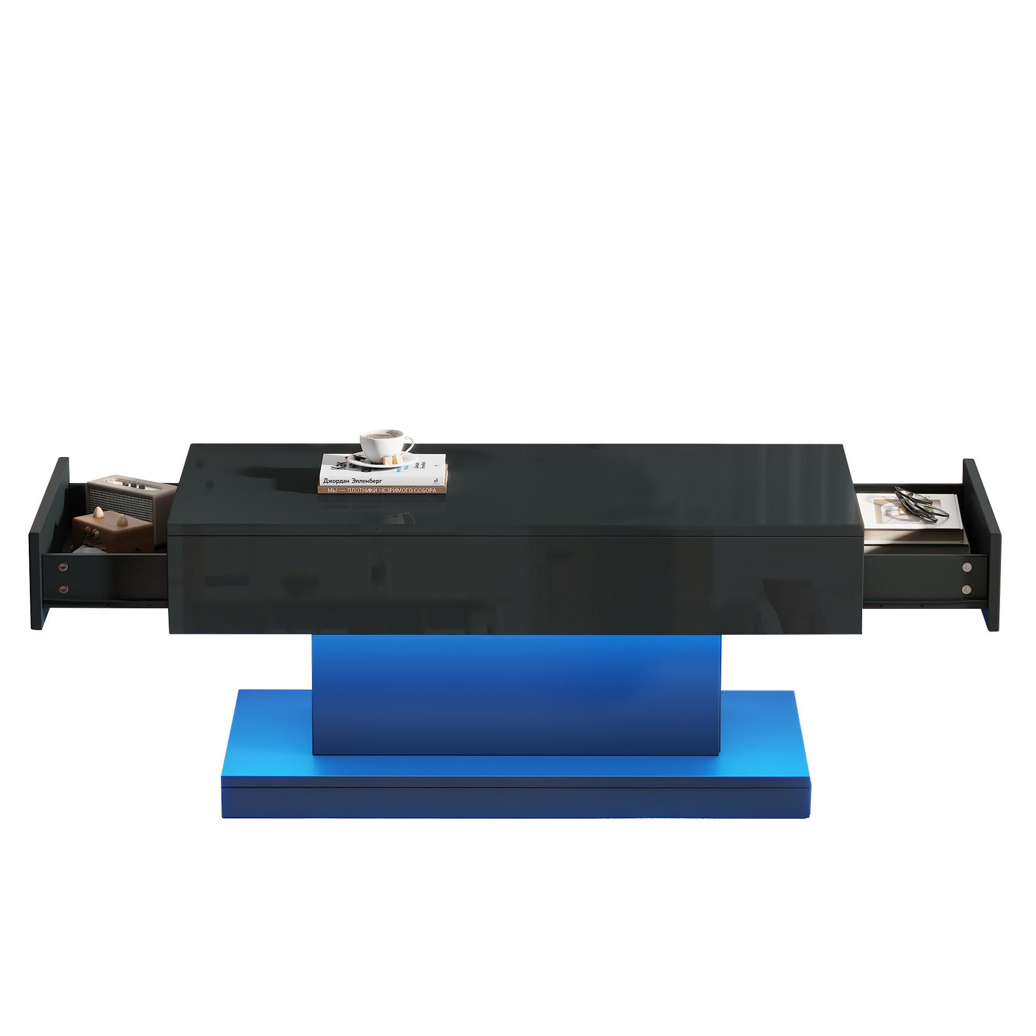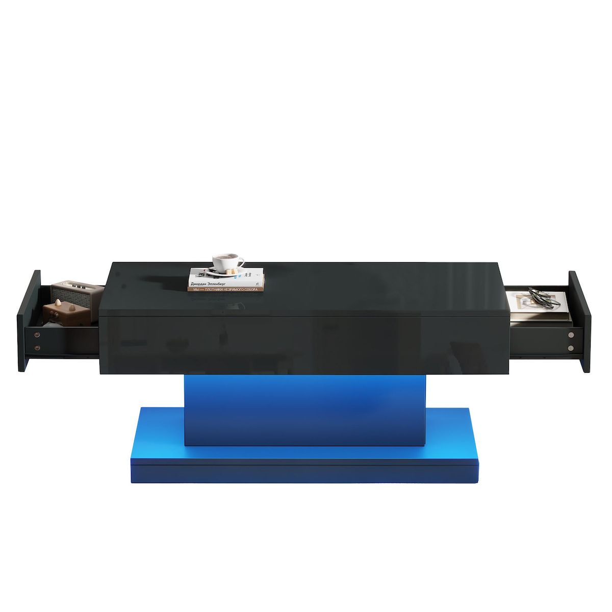 Cette table basse présente un design unique en forme de I, large en haut et en bas et étroite au milieu. Son extérieur est doté d'une finition brillante (un cercle brillant autour du plateau et des tiroirs). À la fois simple et élégante, elle apportera une touche tendance à votre salon.