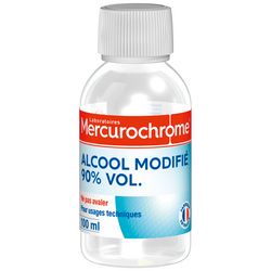 L'alcool modifié 90% vol. des Laboratoires Mercurochrome est indiqué pour usages techniques. Il permet la désinfection de matériel (ciseaux, thermomètre, pince à épiler, ...).