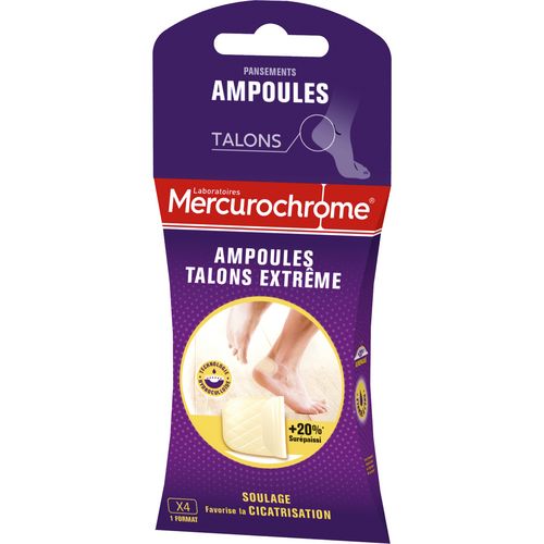 Grâce à leur technologie hydrocolloïde, les Pansements Ampoules Talons EXTRÊME +20% surépaissi* des Laboratoires Mercurochrome® soulagent la douleur lors de l’apparition de l'ampoule et facilitent la cicatrisation.