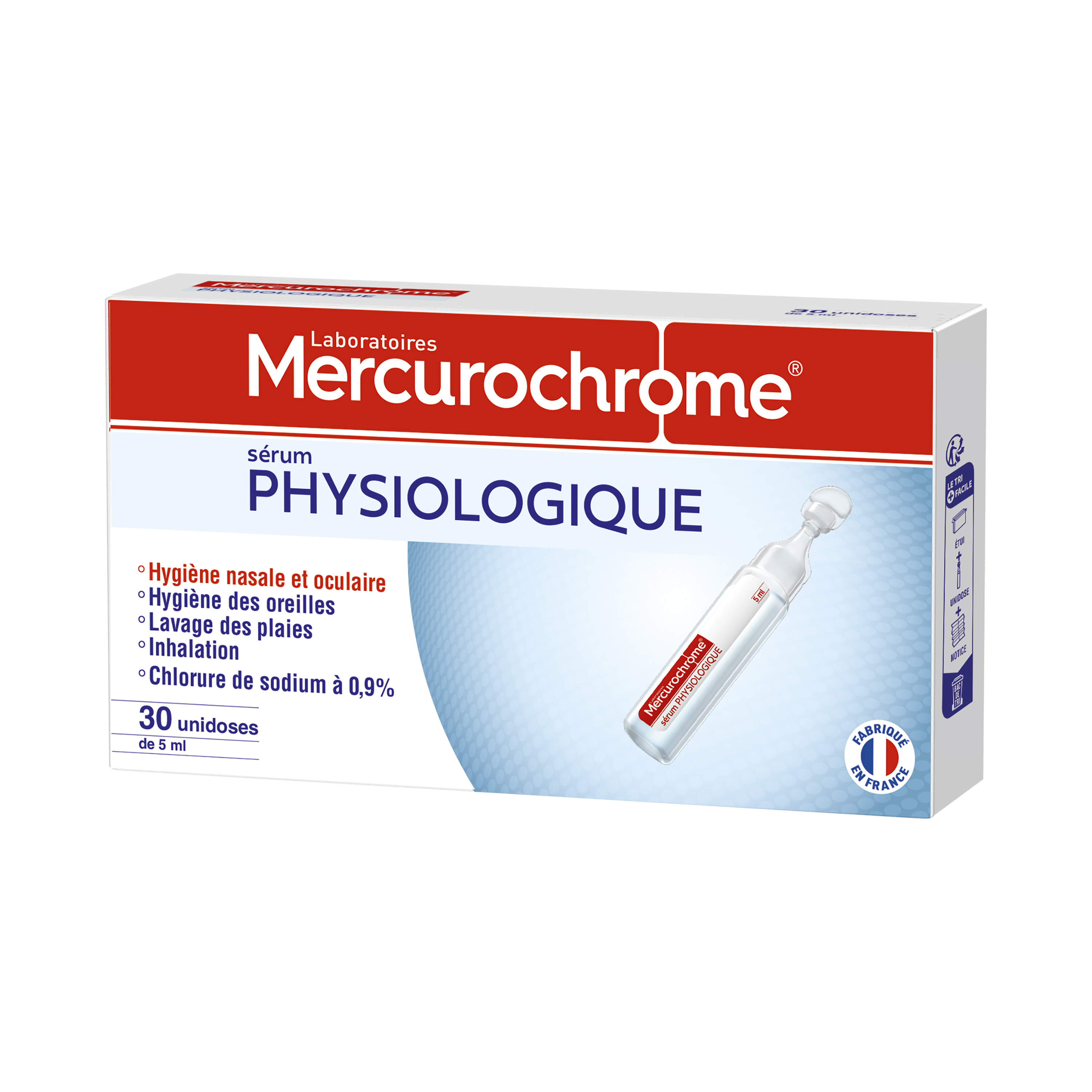 Le Sérum Physiologique des Laboratoires Mercurochrome® convient à l'hygiène nasale et oculaire des nourrissons, des enfants et des adultes.