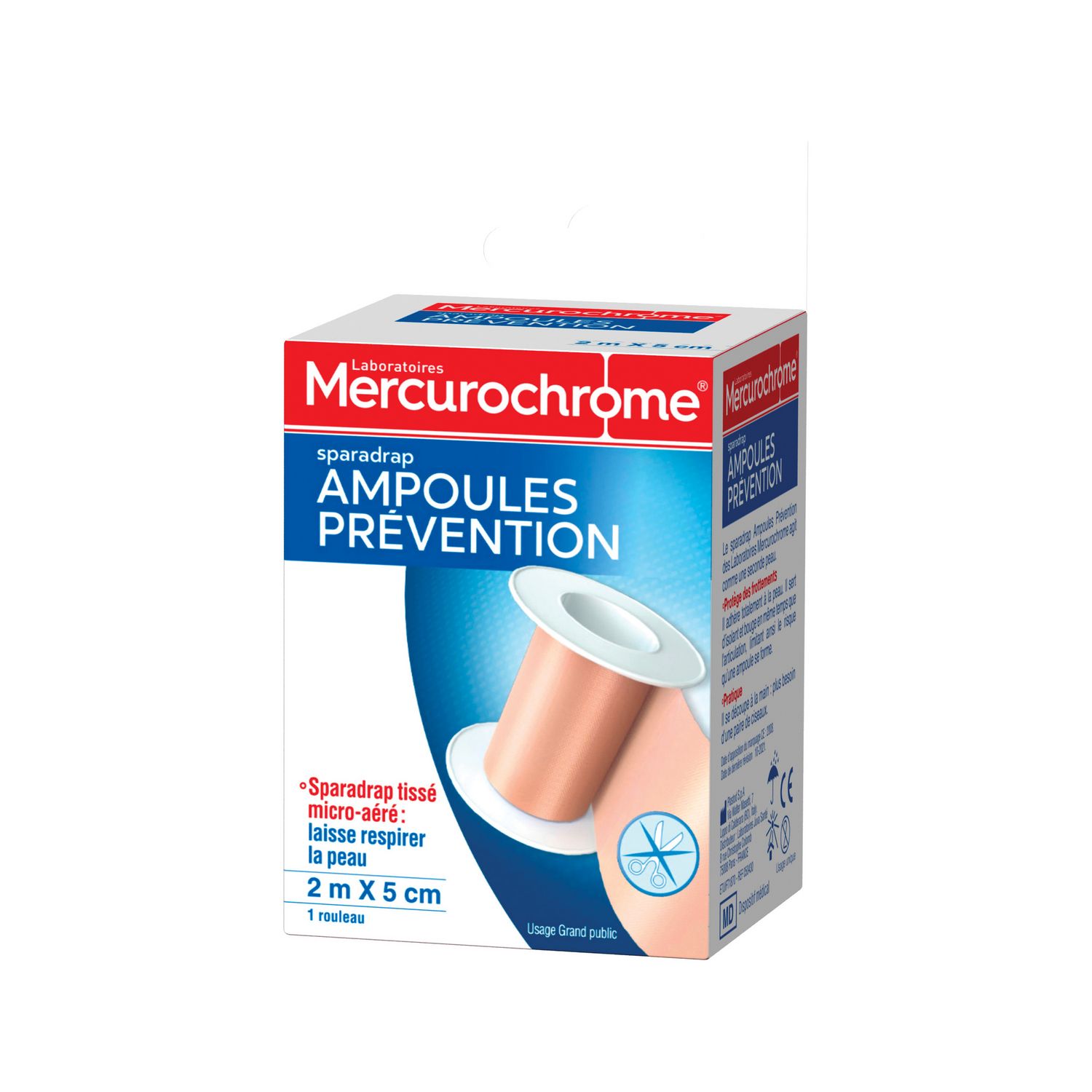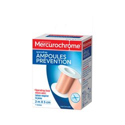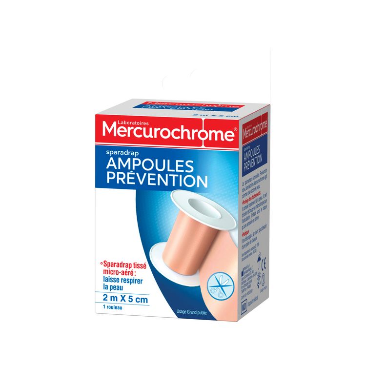 Le Sparadrap ampoules prévention des Laboratoires Mercurochrome est destiné à la protection contre les frottements et à la limitation du risque d'apparition des ampoules pour la population générale.