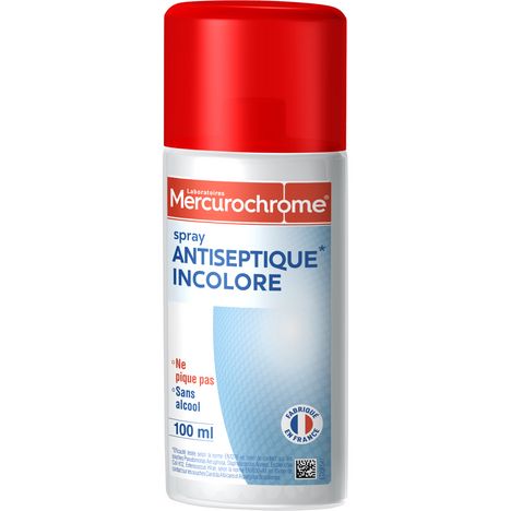 Le spray antiseptique* des Laboratoires MERCUROCHROME est non irritant : Il permet de nettoyer la peau sans douleur et vous assure une parfaite hygiène cutanée.*Efficacité testée selon la norme EN1276 en 5min de contact sur les souches Pseudomonas Aeruginosa, Staphylococcus Aureus, Escherichia Coli K12, Enterococcus Hirae, selon la norme EN1650+A1 en 15 min de contact sur les souches Candida Albicans et Aspergillus Brasiliensis.