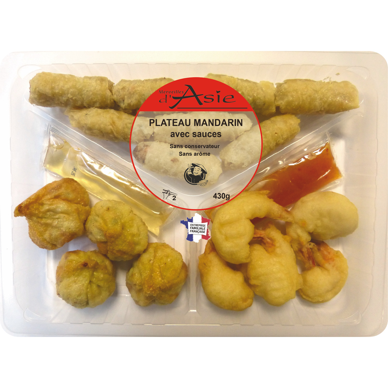 3 saveurs de la Chine réunies en un seul plateau. Le plateau mandarin est une barquette assortiment rassemblant trois produits de nos spécialités : raviolis chinois, beignets de crevette, Apérinems, dosettes de sauce exotique, dosettes de sauce piment.