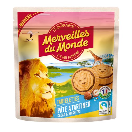 farine de blé , pâte à tartiner aux noisettes (40,0%) (sucre, matières grasses végétales (huile de colza et tournesol), pâte de noisette , cacao maigre en poudre, lait écrémé en poudre, beurre de cacao, lactosérum en poudre, émulsifiant : lécithines de soja , arôme naturel), sucre, beurre pâtissier, huile de tournesol, poudre d'amandes (1,8%), poudre de noisettes (1,6%), extrait de malt d'orge , levure inactive en poudre, sel, poudres à lever (carbonates de sodium, carbonates d'ammonium), arôme naturel, arôme naturel de vanille avec autres arômes naturels