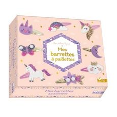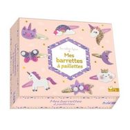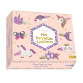 Voici une boîte qui contient tout le matériel pour créer 8 barrettes en feutrine et en paillettes multicolores. Une barrette papillon, une barrette arc-en-ciel, une barrette petite licorne et bien d'autres encore ! En suivant les pas-à-pas du livret, l'enfant pourra réaliser des bijoux prêts à être portés !