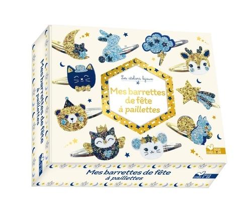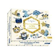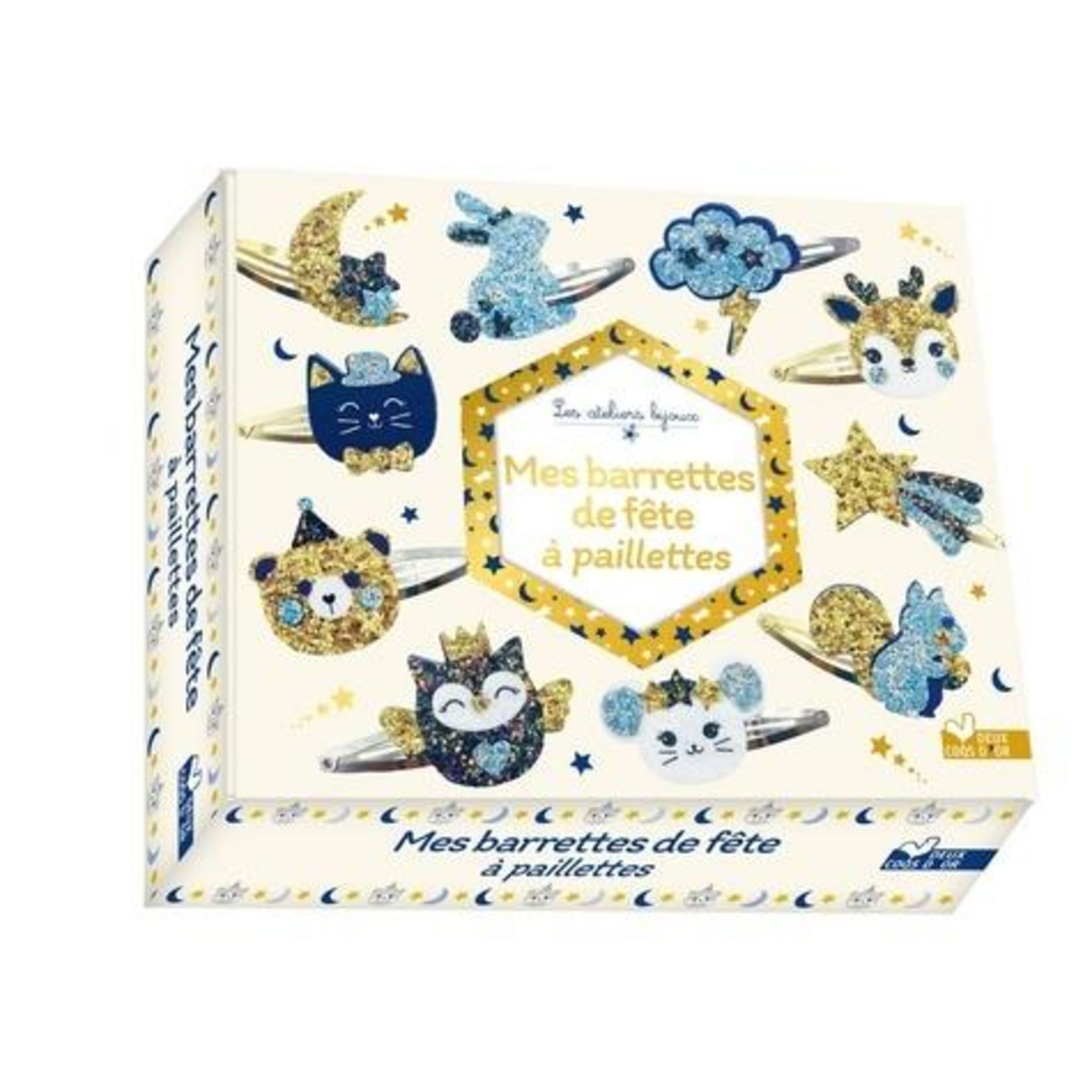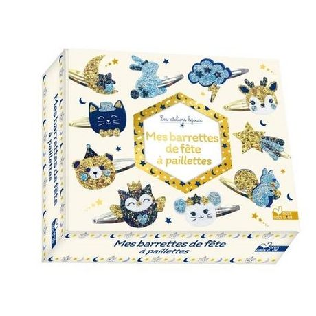 Un coffret contenant tout le matériel nécessaire pour créer 10 barrettes en feutrines pailletées sur le thème des animaux et de la fête (une lune, un lapin, un chat, un ours, une chouette, un écureuil, une étoile filante, un cerf et un nuage). 5 planches de feutrine douces et pailletées pré-découpées et imprimées (argent, or, noir, bleu marine et blanc). 10 barrettes clic clac argentées et dorées. Un livret avec des pas-à-pas illustrés et détaillés pour chaque accessoire permet à l'enfant de fabriquer lui-même ses barrettes prêtes à être portées !