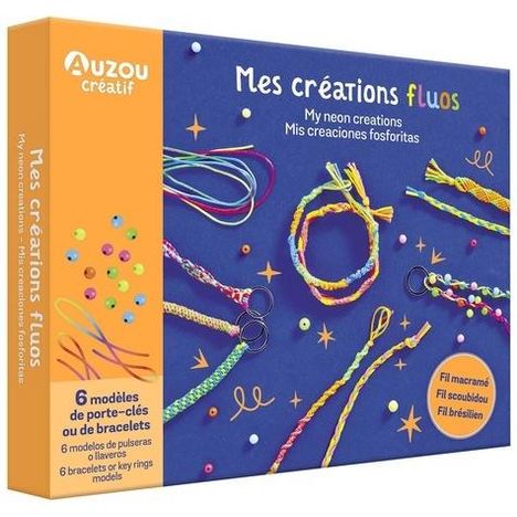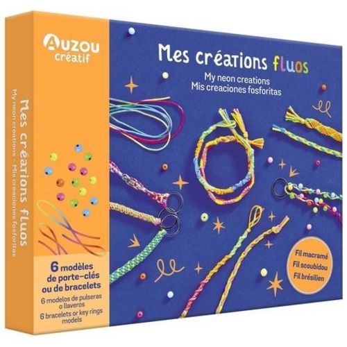 En savoir +Découvre dans ce super coffret tout pour réaliser plein de belles créations aux couleurs fluorescentes ! Des scoubidous, du fil brésilien, des perles multicolores, te permettront de réaliser bracelets, grigris et porte-clés. Contenu : 10 fils de scoubidous, 5 fils brésiliens, un fil multicolore, 50 perles fluos, 2 anneaux de porte-clé.