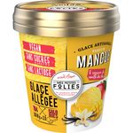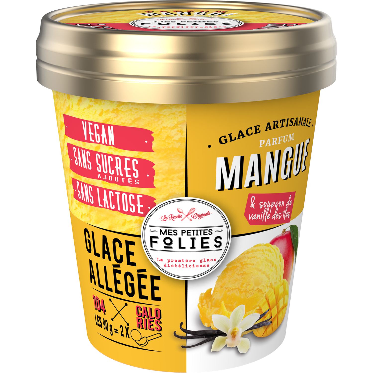 Eau, purée de mangue 25 % sans sucres ajoutés, édulcorants (maltitol, érythritol), huiles végétales (tournesol, coco), racine de chicorée, protéine végétale, stabilisants (mono- et diglycérides d’acides gras, gommes de caroube et guar, carraghénanes), arôme vanille, poudre naturelle de vanille