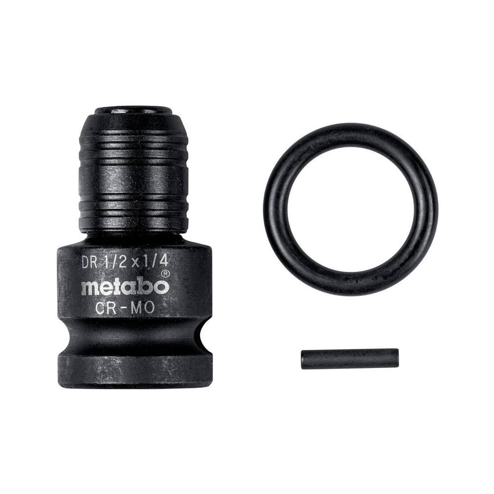 - Adaptateur de frappe de 3 pièces (avec anneau de sûreté et goupille de fixation) avec carré femelle 1/2 côté machine et six pans creux 1/4 pour des outils antichocs avec une queue de 1/4