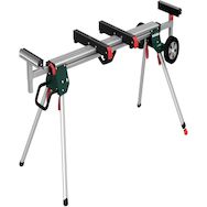 Socle pour scie à onglets léger et robuste avec fonction Trolley pour l'utilisation mobile avec scie montéeRapidement prêt à l'emploi grâce aux pieds verrouillables et à la possibilité de réglage pour plus de stabilitéSupports de pièces à usiner escamotables avec roulettes et butée rabattable pour d