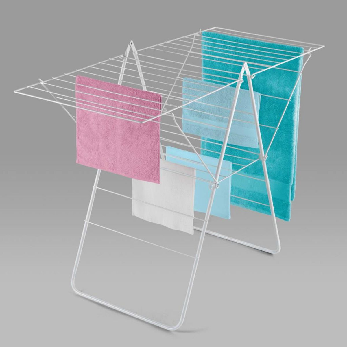 L'etendoir a linge pliable est ideal pour secher vos vetements, serviettes et linge de lit, car vous pouvez regler les ailes en hauteur. Le sechoir est en acier avec un revetement de PEBD (polyethylene basse densite), un revetement standard mondial solide mais doux pour les produits en fil de fer/d'acier. Le revetement protege egalement le sechoir contre la rouille.