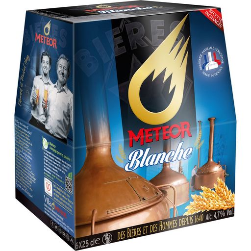 Née d’une recette particulière alliant des malts d’orge et de blé, la Blanche de Meteor séduira tous les palais par son goût floral et peu amer. Sa robe immaculée, typique des bières Blanches révèle en bouche des accords acidulés et épicés. Particulièrement désaltérante, elle dévoile sous sa mousse légère une fraîcheur extrême. A déguster avec une rondelle de citron pour encore plus de sensations ! Bière blanche