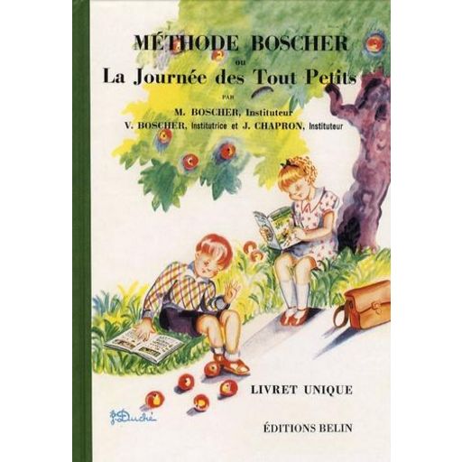 Livret unique, illustrée par Jacqueline Duché. En 1903, Mathurin Boscher devient instituteur et commence à mettre au point une méthode qui tient compte des premières exigences - savoir, lire, écrire, compter - et de la répartition de ces diverses tâches dans une journée. Ayant achevé son travail, illustré de ses dessins, il fait imprimer, en 1906, à Saint-Brieuc, son fameux petit livre à la couverture orange... Le manuel est très vite couronné de succès et les commandes affluent de la France entière. L'idée de départ de Mathurin Boscher est d'apporter un prolongement aux abécédaires de l'époque et d'organiser la Journée des Tout Petits en fournissant aux instituteurs un matériau de base sur lequel ils peuvent construire leurs leçons. Cette méthode, géniale dans sa simplicité, doit s'adapter : en suivant le progrès de la science de l'éducation et celui de l'édition. C'est pourquoi, après le décès de l'auteur, en 1915, Madame Boscher, aidée de Joseph Chapron, également instituteur, augmentent le format du manuel, et font appel à Madame Duché pour ajouter de nouvelles illustrations. Ces changements donnent naissance à la première méthode en couleur : la version verte de la méthode Boscher !