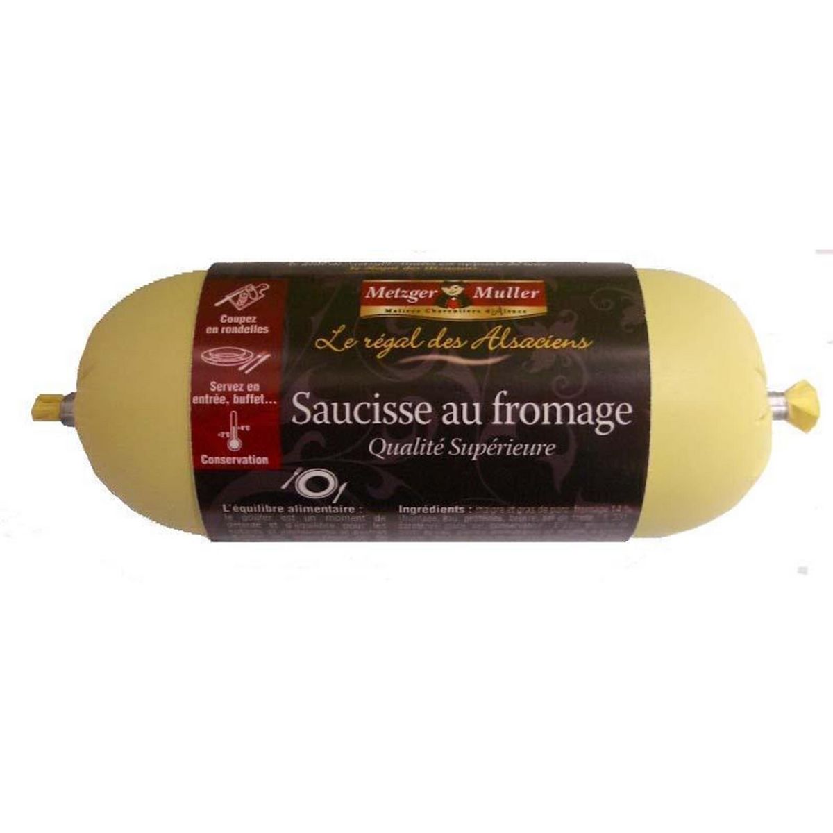 Ingrédients : Viande de porc (59%), FROMAGE 19% (FROMAGE, eau, BEURRE , PROTEINES DE LAIT, émulsifiant : E331, régulateur d'acidité : E330, conservateur : E202, colorant : E160a), glace, gras de porc, sel, sucres : dextrose, sirop de glucose, épices et plantes aromatiques, émulsifiant : E450, plasma de porc, arômes naturels, antioxydant : E300, E301, conservateur : E250. Enveloppe non comestible.