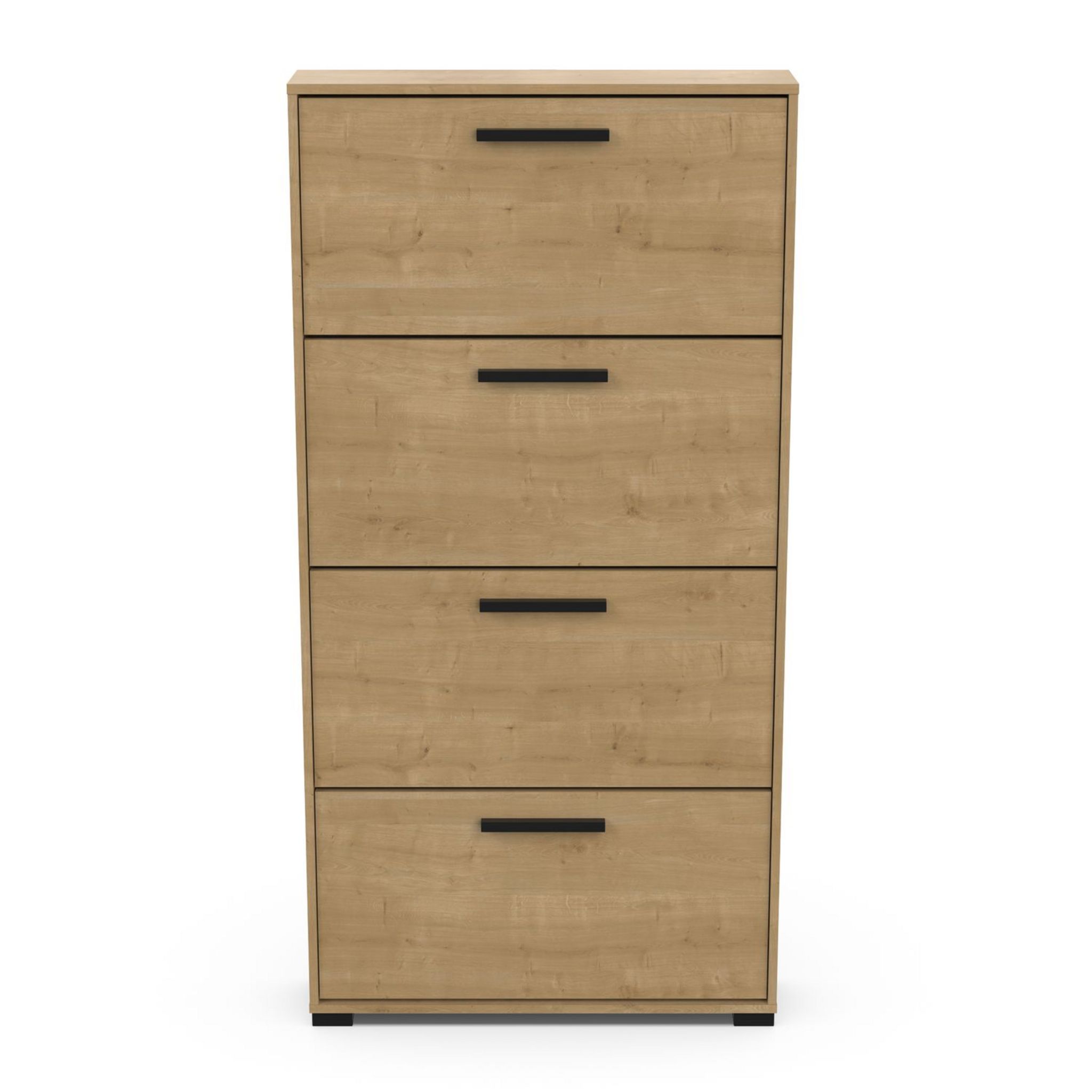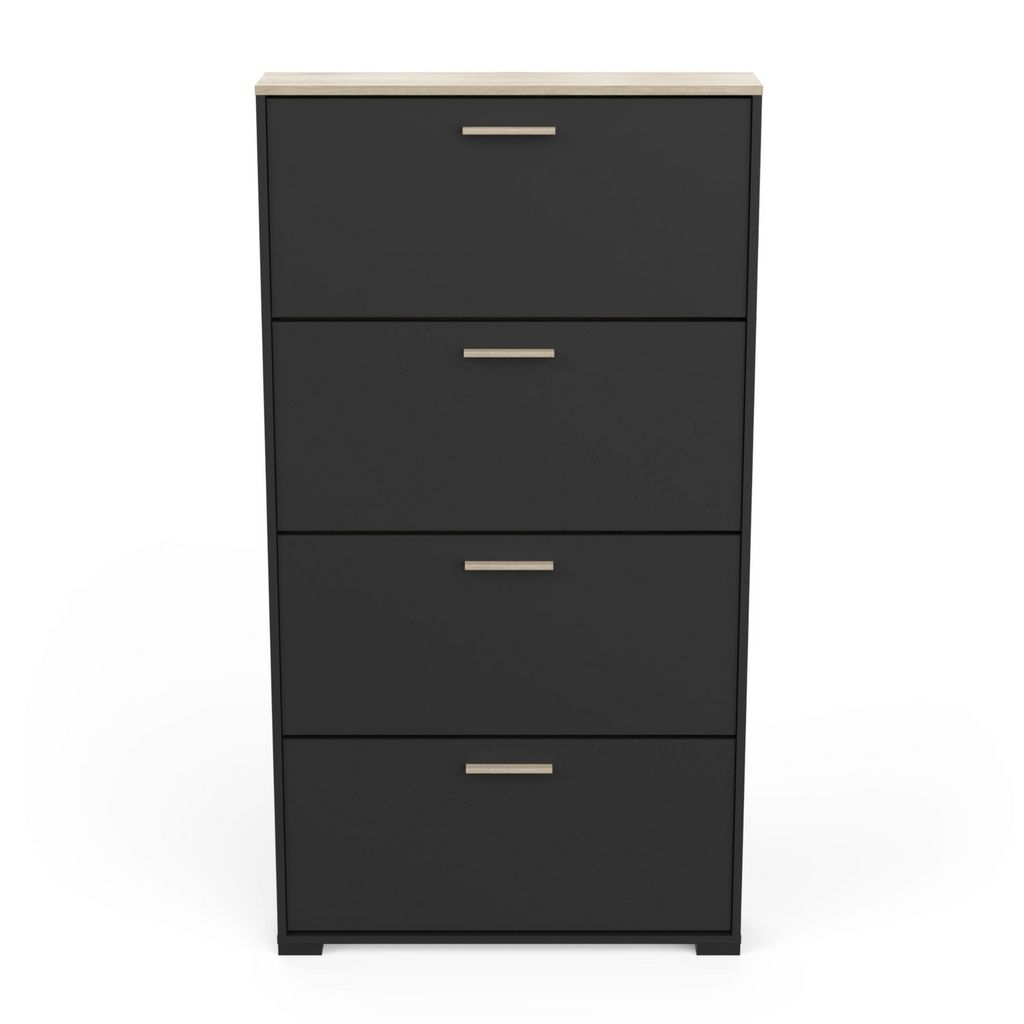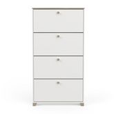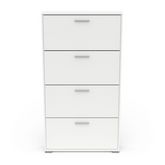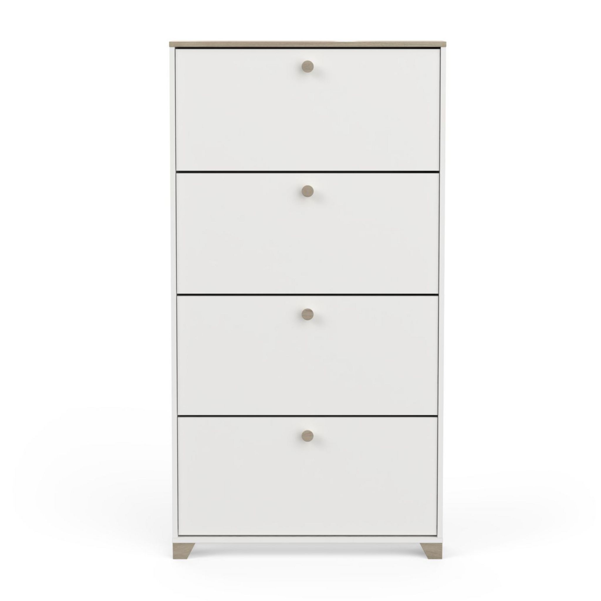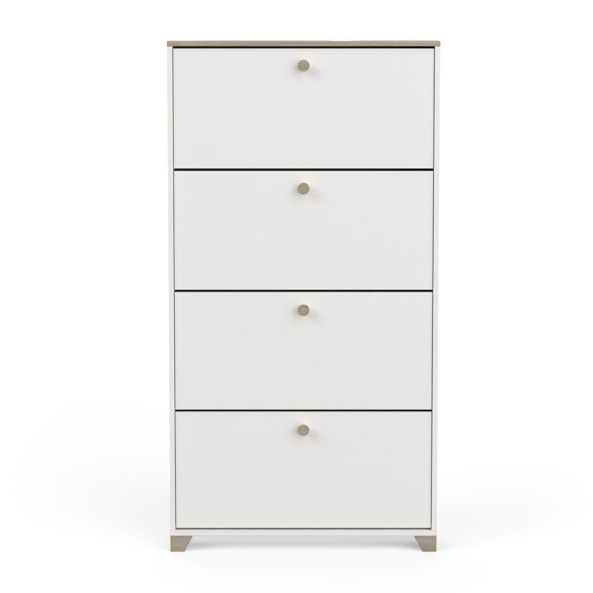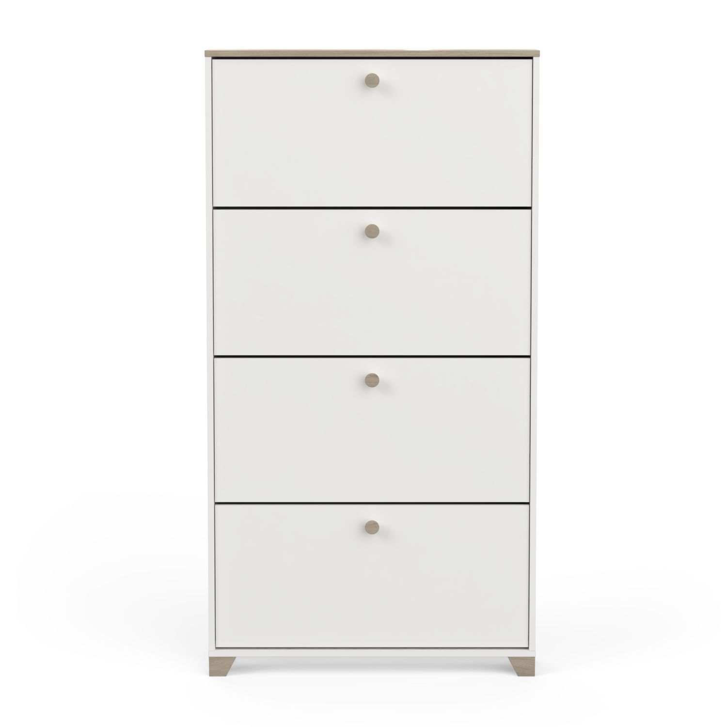 Rangement chaussures 4 abattants en panneaux de particules 15mm. Décor papier blanc mat. Capacité 12 paires à chaussures.