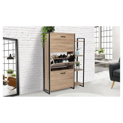 Le meuble chaussures Théo 3 portes permettra de ranger jusqu'à 18 paires en gagnant de la place dans votre entrée. Les étagères apporteront du rangement supplémentaires à ce meuble. Ce meuble moderne au style industriel a une structure métallique noir associée au coloris chêne très tendance.