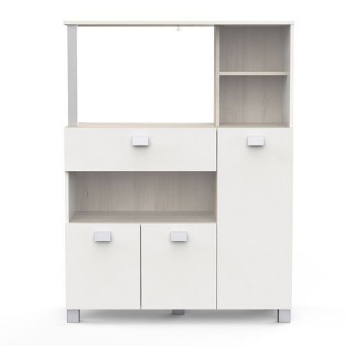 Besoin d'un meuble de cuisine avec rangement ? ce meuble Pesto est fait pour vous! Sa teinte neutre s'harmonise facilement dans votre cuisine, buanderie ou arrière cuisine. Cette grande structure, avec 3 portes, 1 tiroir et des niches ouvertes vous apporteront tout le rangement nécessaire pour stocker alimentation, vaisselle et même y placer votre micro ondes. Compact et pratique, ce meuble de cuisine fabriqué en France se nettoie facilement et résiste à l'eau grâce à son revêtement 100% mélamine.