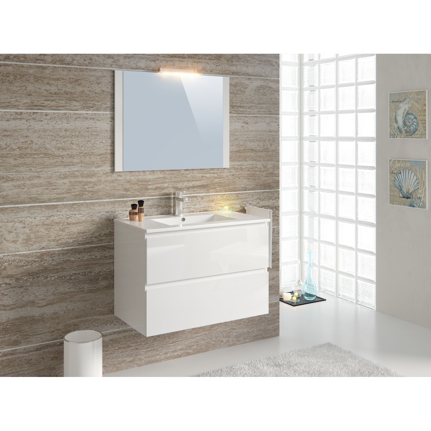 Meuble salle de bains fabriqué en mélamine blanche brillant pour les côtés du meuble et mélamine blanche lacqué brillant pour les façades des troirs. Défoncement des façades pour la prise de main. Plan de vasque en céramique blanche. Meuble avec 2 tiroirs, 1 tiroir supérieur avec rangements intérieurs et 1 grand tiroir inférieur pour le rangement des serviettes etc. Miroir et led inclus. Meuble très fonctionelle qui peut se marier dans quelque salle de bains. One box.