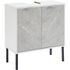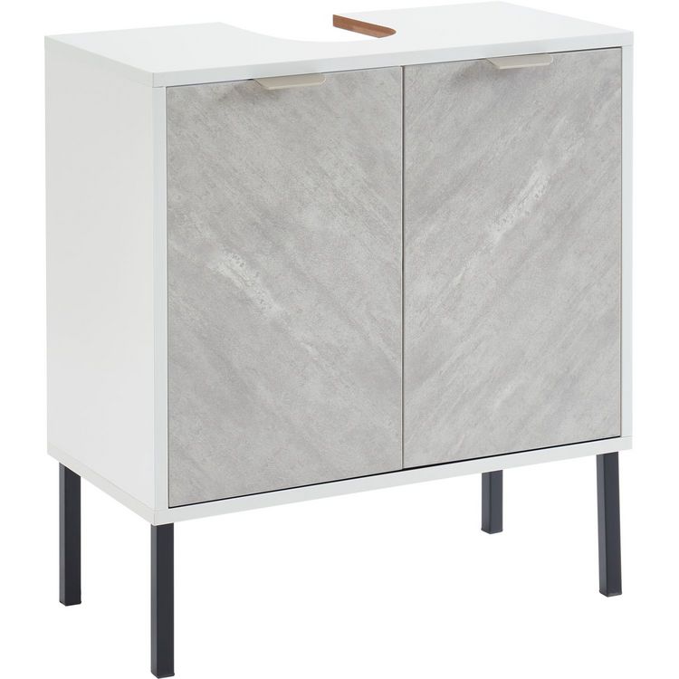 Meuble sous vasque pour salle de bain MAO - Structure MDF - Revêtement mélaminé blanc et béton gris clair - 2 portes - Poignées en métal en acier inoxydable brossé - Pieds en métal noir - Dimensions : L60 x P29,5 x H65cm