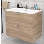 Un meuble de salle de bain simple et moderne à la fois? Ne cherchez plus le meuble Faro est fait pour vous ! Pratique, il possède deux tiroirs pour y ranger serviettes et produits de toilettes. En blanc ou chêne, cet élément s'adaptera facilement dans votre pièce d'eau avec une vasque en résine blanc brillant.