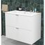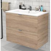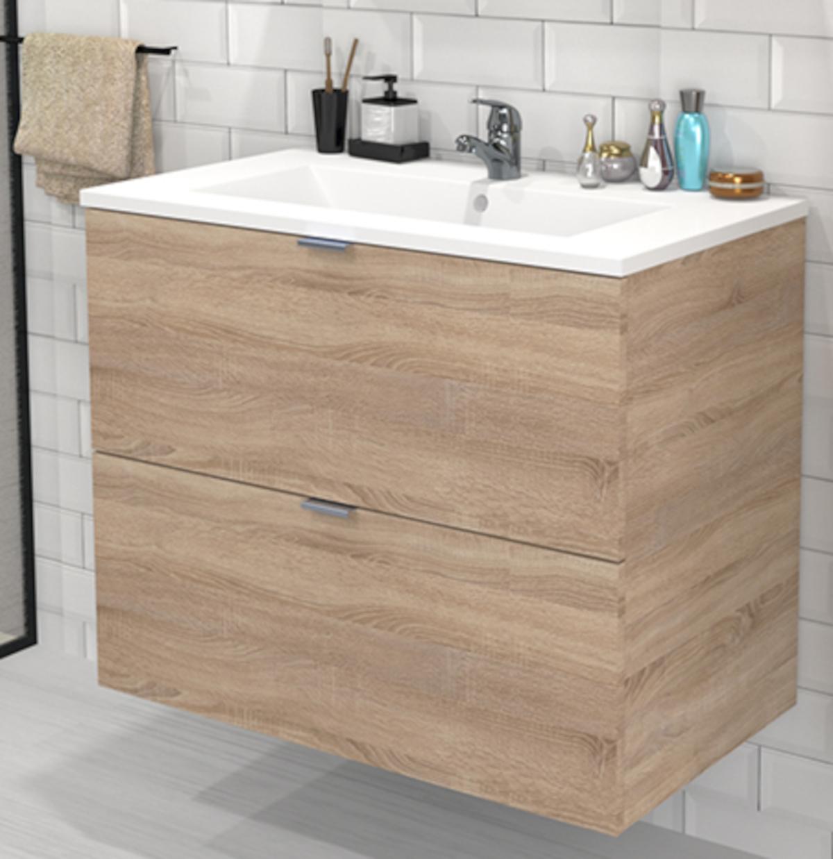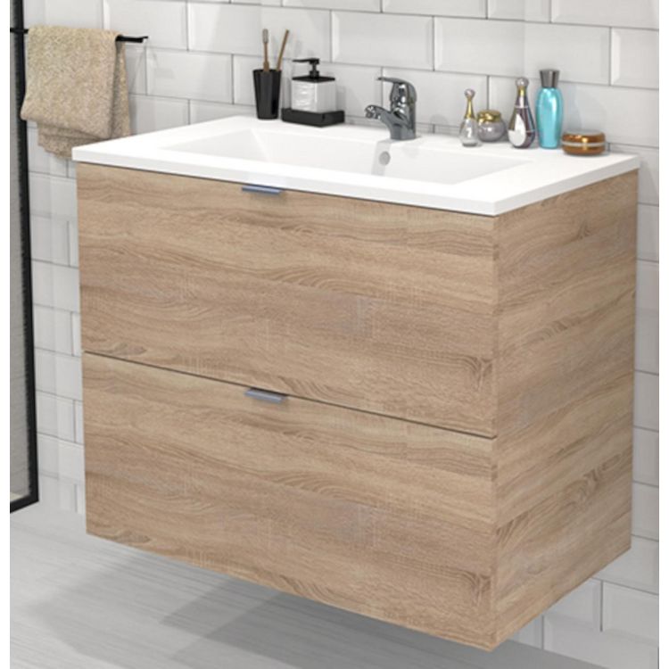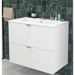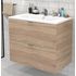 Un meuble de salle de bain simple et moderne à la fois? Ne cherchez plus le meuble Faro est fait pour vous ! Pratique, il possède deux tiroirs pour y ranger serviettes et produits de toilettes. En blanc ou chêne, cet élément s'adaptera facilement dans votre pièce d'eau avec une vasque en résine blanc brillant.