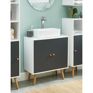 Meuble sous vasque MAX de style scandinave pour salle de bain blanc et gris en panneau de particule finition mélaminé. 2 portes avec 1 étagère. 4 pieds en bois massif d'eucalyptus - Dimensions : 60x29.5x65cm