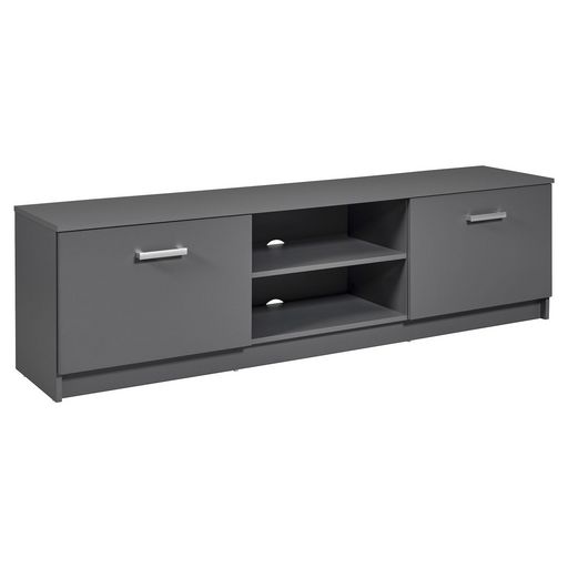 Cette commode TV moderne offre de nombreuses possibilités de rangement. Elenzio est doté de 2 portes et de 2 compartiments ouverts : beaucoup d'espace de rangement que vous pouvez équiper comme vous le souhaitez. La surface est en gris graphite. Le revêtement en mélamine est résistant aux rayures et aux frottements.