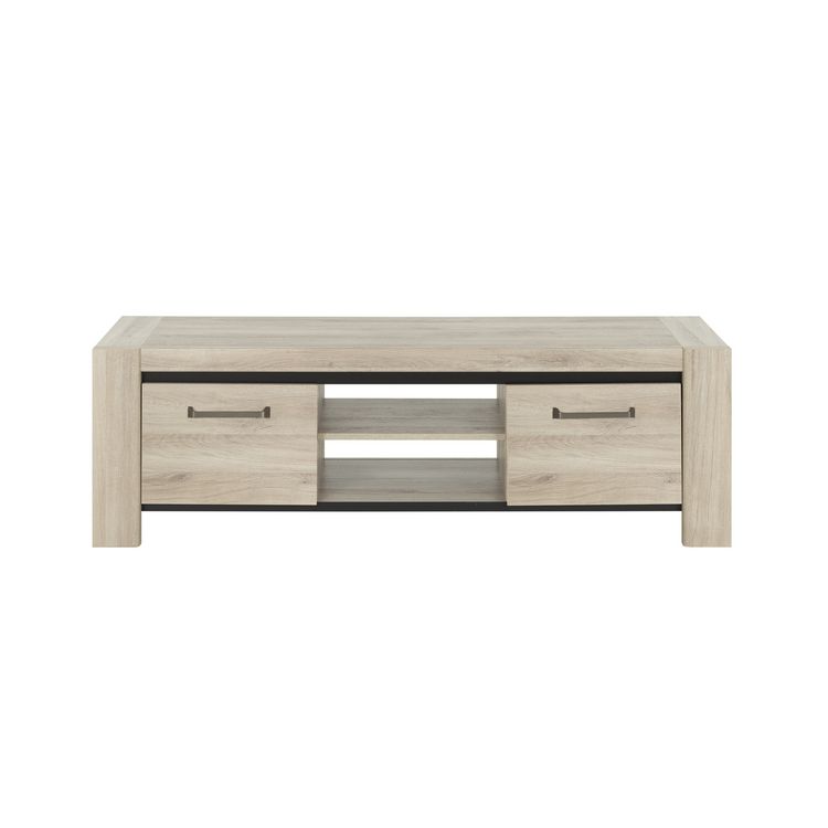Décor Chêne clair structuré et Noir, 2 espaces de rangement fermés sur les côtés et 2 niches ouvertes en partie centrale pour installer le matériel hifi vidéo, box, console..., Poignées en métal.