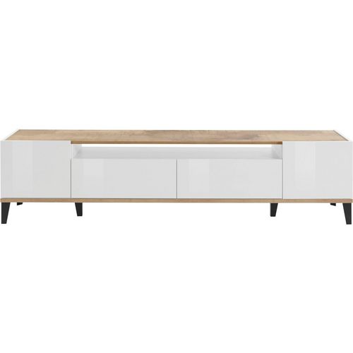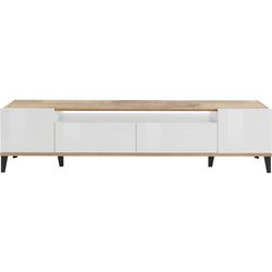 Le meuble TV Bari, de largeur 200 cm, trouvera immédiatement sa place dans votre salon avec son look moderne et industriel à la fois. L'association du blanc/effet bois ou ardoise/effet bois fera tout le charme de ce meuble de rangement pratique avec son tiroir, sa niche et sa porte battante. Il vous permettra d'y ranger vos accessoires multimédia facilement. Les pieds de ce meuble TV viendront également apporter le côté design et vous facilitera la nettoyage sous le meuble.