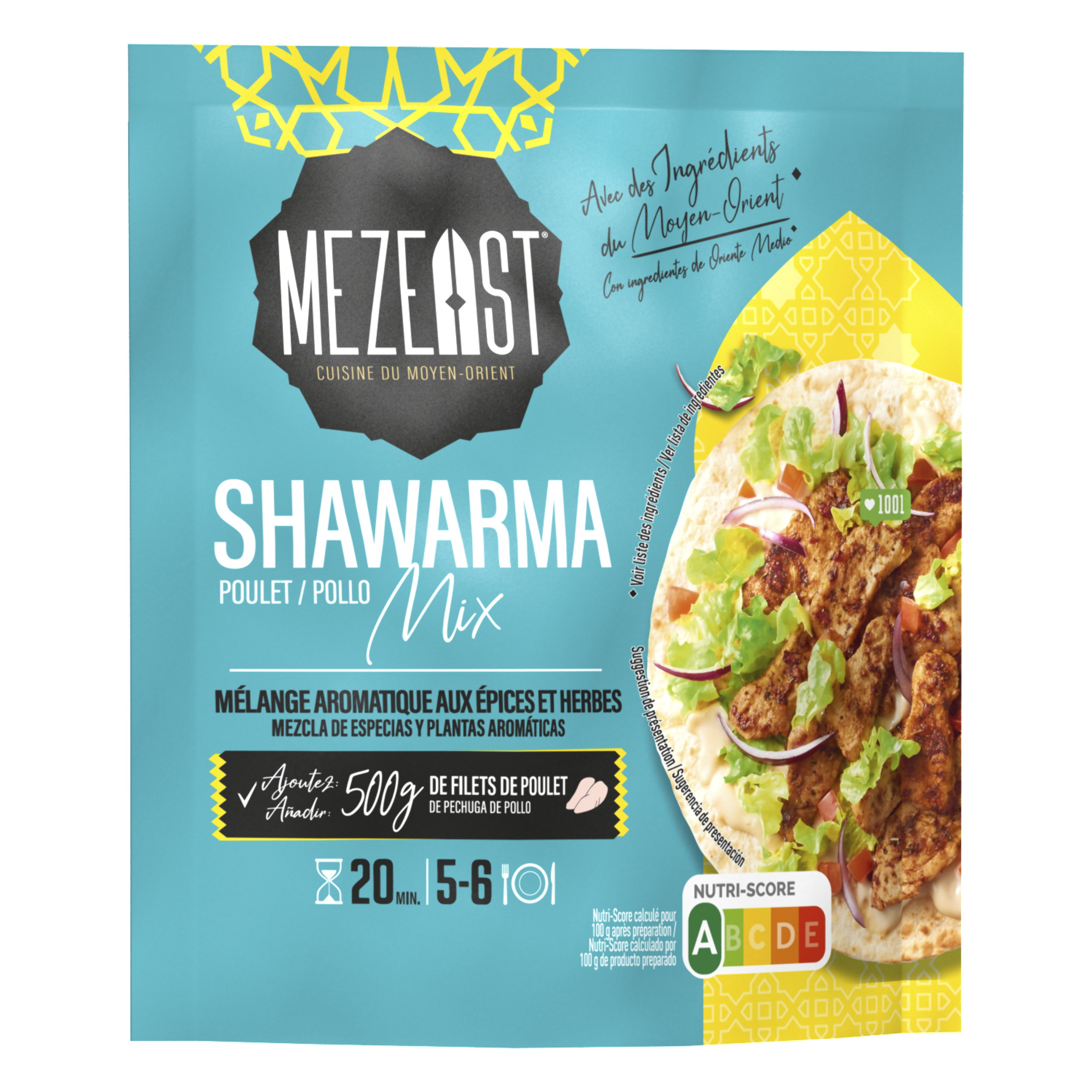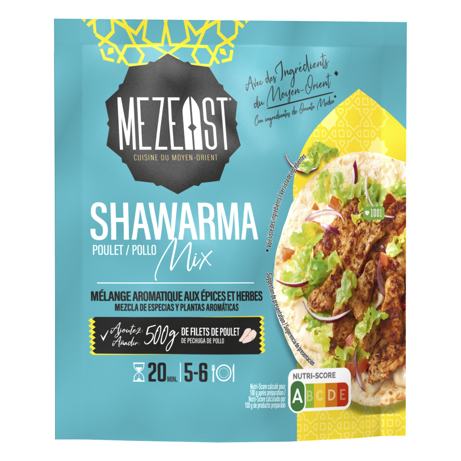 Liste de courses : 500 g de filets de poulet. Coupez les filets de poulet en lamelles. Mélangez 2 c. à soupe d'huile d'olive (20 g) avec le Mélange pour Shawarma puis faites mariner le poulet dans la préparation pendant 5 min. Faites revenir le poulet dans une poêle à feu moyen en remuant de temps en temps, jusqu'à ce qu'il soit bien doré.