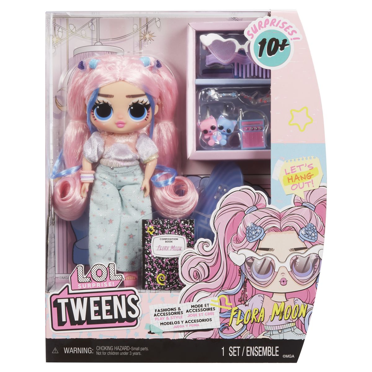 Voici une toute nouvelle L.O.L. Surprise Tweens, la poupée mannequin Flora Moon, astronome et collectionneuse de cristaux. Déballez et découvrez plus de 10 surprises puis apprenez a connaître Flora Moon.Sa tenue comprend également un pull violet tendance a manches courtes, des lunettes de soleil en forme de coeur, un adorable bracelet, des pinces a cheveux en forme de coeur et un joli sac a dos sur le theme du chat ! Elle contient également un skateboard et un haut-parleur radio pour se rendre la où elle va dans son style décontracté.