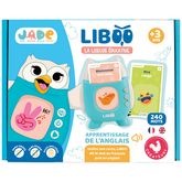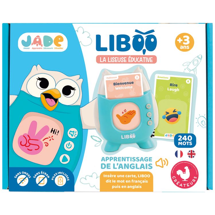 Explorez la liseuse Liboo : outil d'apprentissage avec 120 cartes pour 240 mots en 13 catégories, de la famille aux couleurs. Prononce les mots en français et anglais, stimulant le vocabulaire et la curiosité des enfants. Fonctionne avec 3 piles AAA incluses, offrant une expérience d'apprentissage visuelle et auditive sans écran.