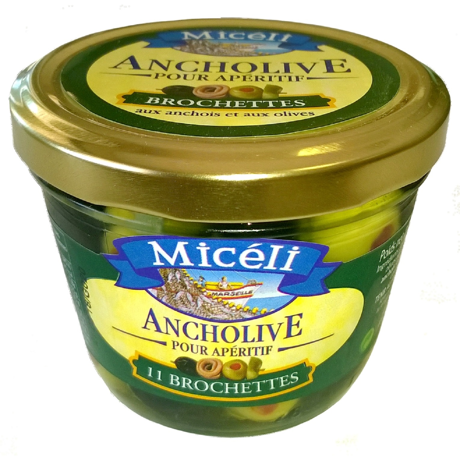 Olives vertes farcies poivrons, olives noires, huile vegetale, ANCHOIS 14%, cornichons, vinaigre, sel.