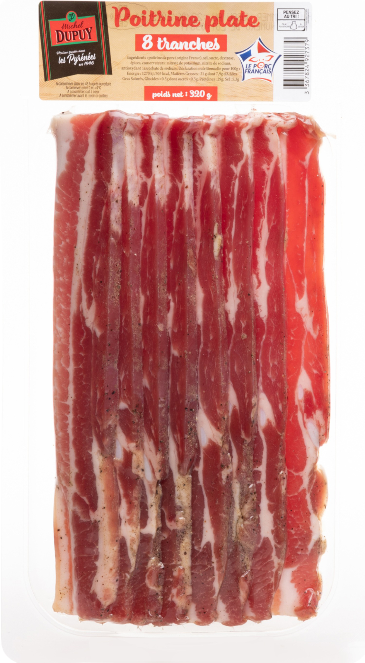 Ingrédients : Poitrine de porc (origine France), sel, sucre, dextrose, épices, conservateurs : nitrate de potassium, nitrite de sodium, antioxydant : ascorbate de sodium