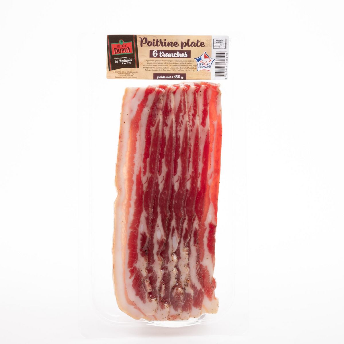 Ingrédients : Poitrine de porc (origine France), sel, sucre, dextrose, épices, conservateurs : nitrate de potassium, nitrite de sodium, antioxydant: ascorbate de sodium