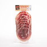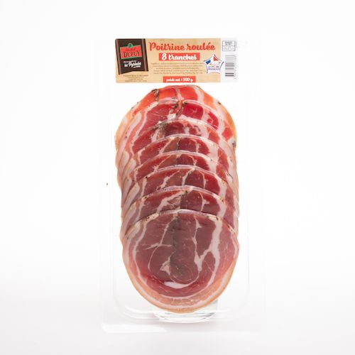 Poitrine de porc (origine France), sel, dextrose, sucre, épices, ail, conservateurs : nitrate de potassium, nitrite de sodium, ascorbate de sodium