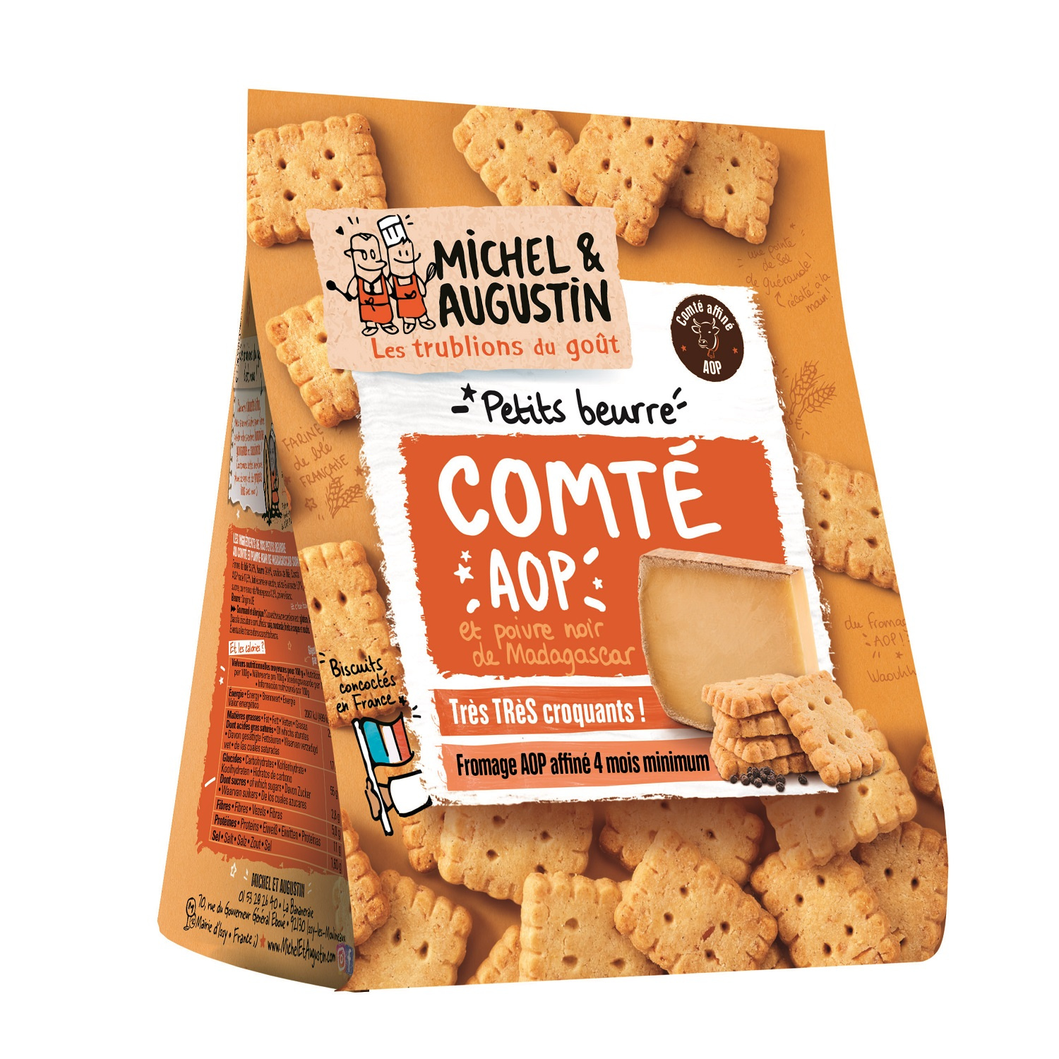 Pour les petits gâteaux apéritifs aux fromages AOP, Michel & Augustin a privilégié de bons fromages français (ainsi que le Parmesan tout droit venu d'Italie et la Féta de Grèce) concoctés en Bretagne.