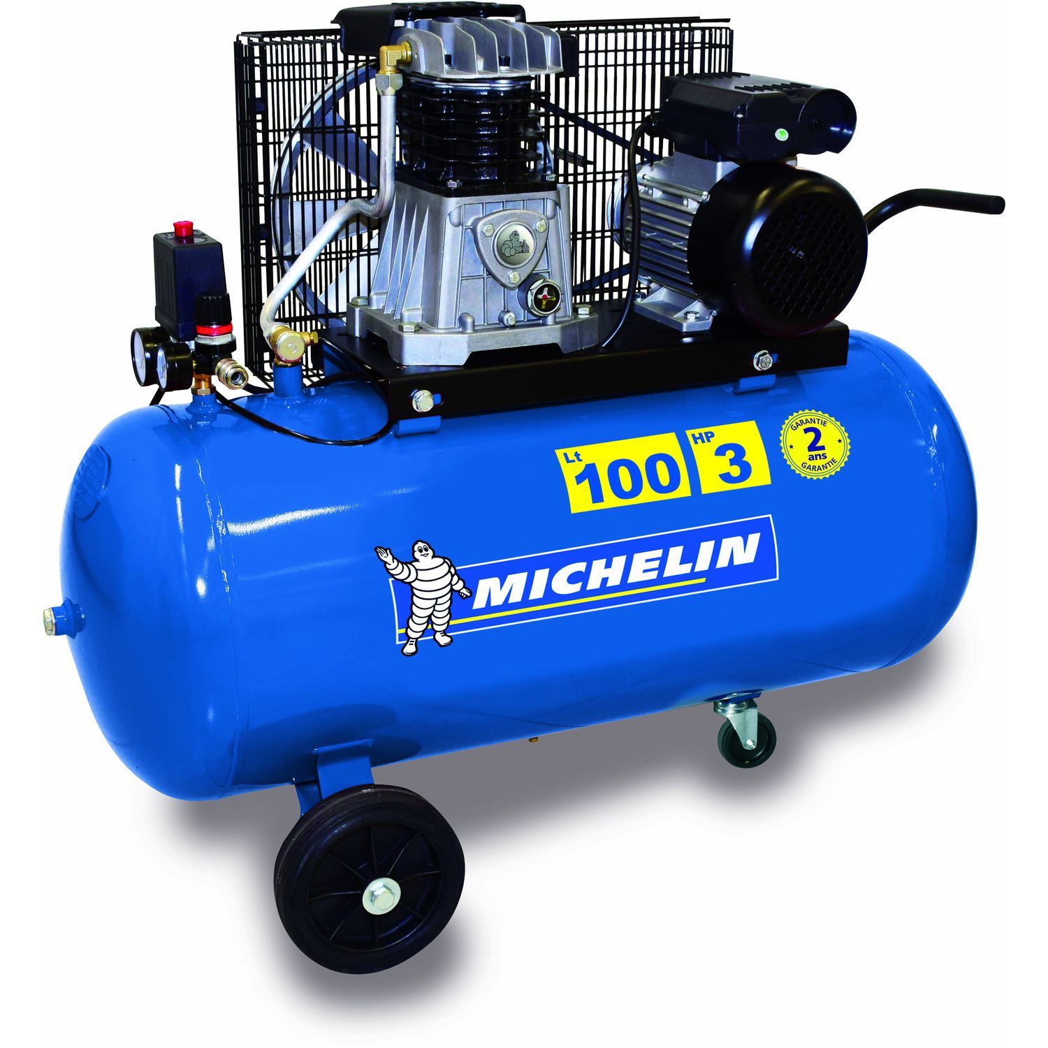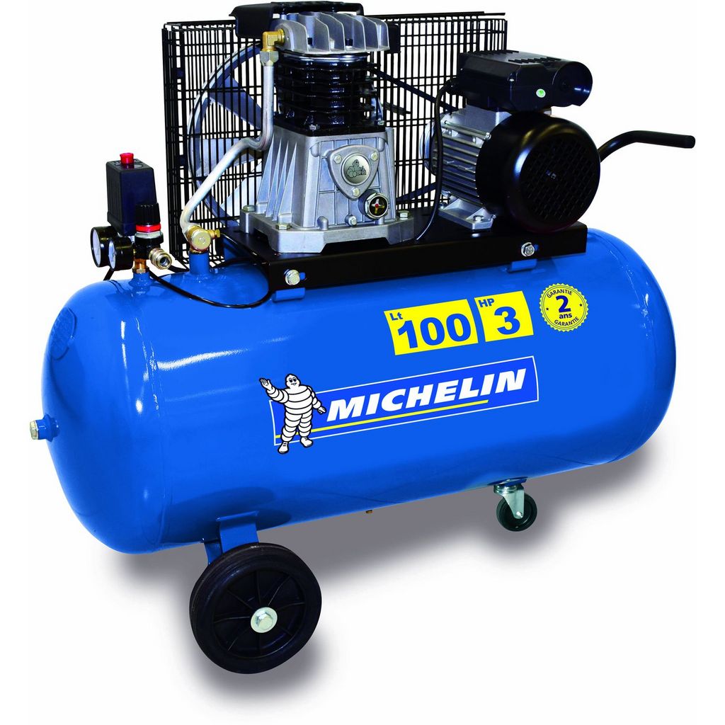 Compresseur 3 CV 100 Litres Michelin -- Moteur 3 HP/230V - Pression maximum: 10 bars réglable - Groupe de compression Courroie - Débit d'air aspiré: 350 l/min - Débit d'air restitué à 7 bars: 240 l/min - 2 Cylindres fonte en ligne - Poids Brut: 69kg - Dimensions déballé (hxLxl) 53x110x40 cm - Provenance Italie - Garantie 2 ans