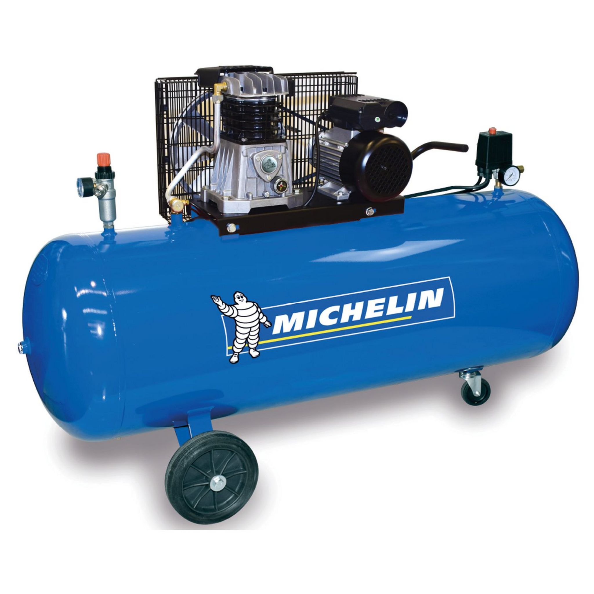 Compresseur 3 CV 200 Litres Michelin -- Moteur 3 HP/230V - Pression maximum: 10 bars réglable - Groupe de compression Courroie - Débit d'air aspiré: 350 l/min - Débit d'air restitué à 7 bars: 240 l/min - 2 Cylindres fonte en ligne - Poids Brut: 97kg - Dimensions déballé (hxLxl) 105x157x54 cm - Provenance Italie - Garantie 2 ans
