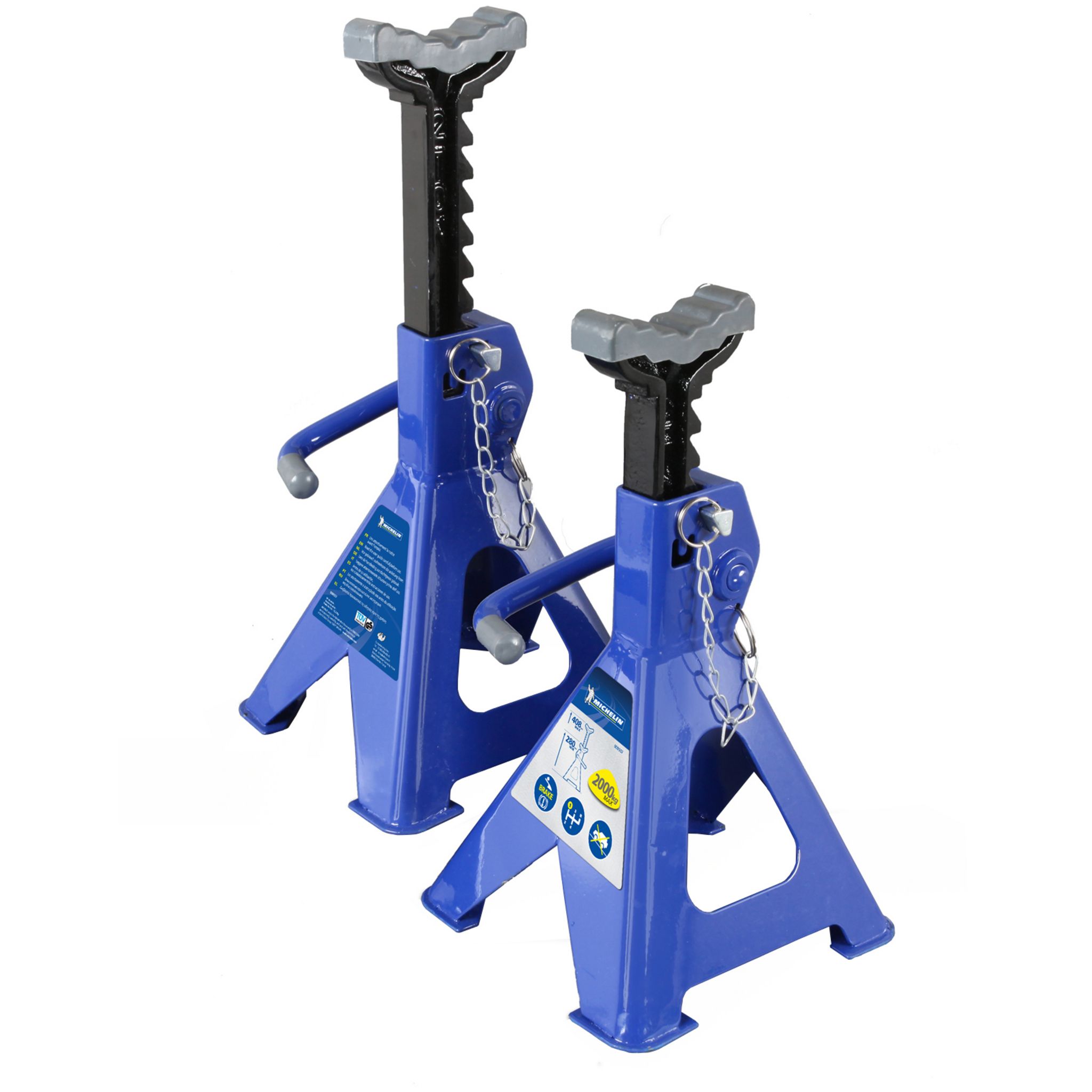 Ce jeu de 2 chandelles à crémaillère MICHELIN bénéficie d'une capacité de levage de 2 tonnes, sur une hauteur maxi de 40.8 cm. Blocage facile et rapide par un levier et une goupille de sécurité. Les pieds larges garantissent une meilleure stabilité.