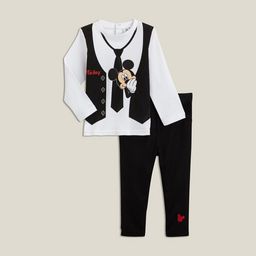 On aime le côté ludique de cet ensemble tee-shirt et pantalon Mickey pour bébé. 100% coton. Agréable à porter. T-shirt à manches longues, col rond, impression amusante sur le devant, ouverture pressionnée à mi-dos facilitant le passage de tête. Pantalon assorti, taille élastiquée, 2 poches, broderie