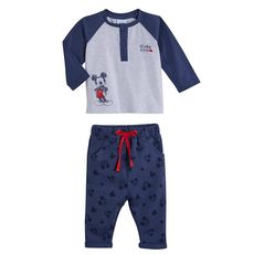 Cet ensemble Mickey pour bébé garçon est aussi craquant que confortable ! Il associe un tee-shirt et un pantalon imprimé. Le tee-shirt à col tunisien, 100% coton, possède des imprimés fantaisie, un col rond et des manches longues contrastées. Le pantalon de jogging imprimé en all-over, hyper con