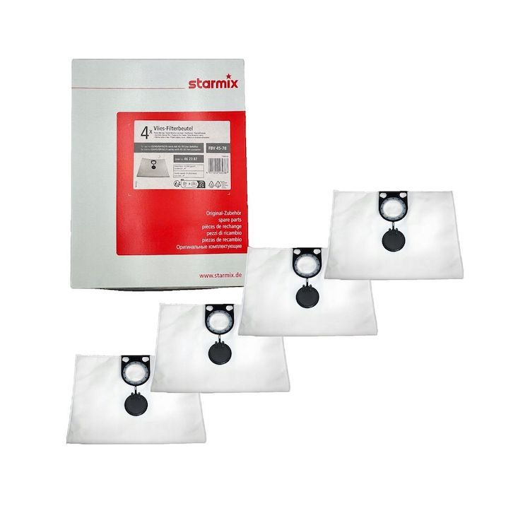 Découvrez les sacs aspirateur Starmix modèle FBV 45/78 fabriqués en microfibre de haute qualité. Ces sacs assurent une excellente filtration et disposent d'une capacité variant de 45 à 78 litres. Ils sont conçus pour un système de montage simple, ce qui facilite leur installation et leur remplacement rapide. Adaptés aux aspirateurs professionnels et industriels Starmix, ils conviennent parfaitement à une utilisation dans des environnements tels que les ateliers et les bureaux. Le lot comprend 4 sacs pour une efficacité et une praticité optimales lors de l'aspiration.