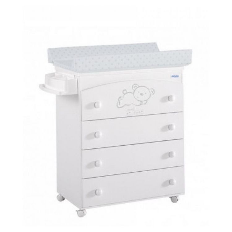 La commode Sweet bear est très pratique, confortable et évolutive.Couleur : Blanc / Ours gris clair. Caractéristiques : Inclus baignoire avec compartiment de rangement en Pvc blanc. Matelas à langer Pvc imprimé de petites étoiles grises. 4 roues avec frein. Conforme aux normes européennes. Dimensions: 93 x 79 x 49 cm