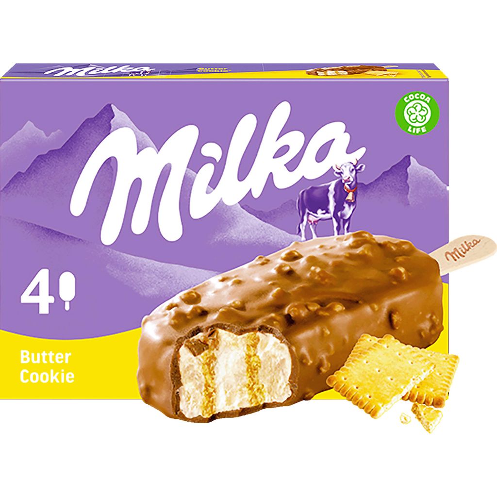 Fondez de plaisir pour le bâtonnet glacé Milka Butter Cookie : une glace onctueuse à la vanille avec une pâte de biscuit et un tendre enrobage au véritable chocolat au lait Milka.